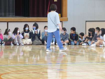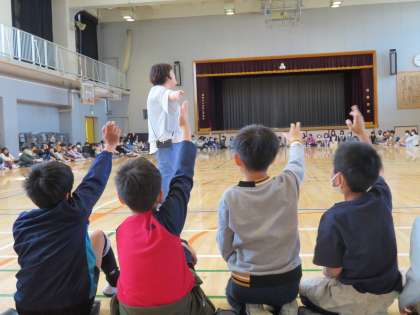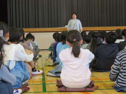4年生は学年集会を行い「言葉」について考えました。また、学年で心を一つにするゲームも行っていました。
