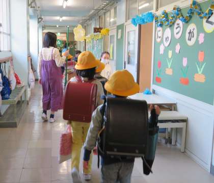 今日も早めに登校した6年生が、1年生の昇降口や教室で、登校してきた1年生のサポートをしています。