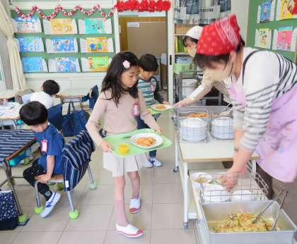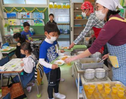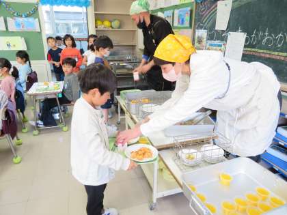 今日から、子どもたちが楽しみにしている給食がはじまりました。1年生は、しばらくの間、配膳は先生が行います。