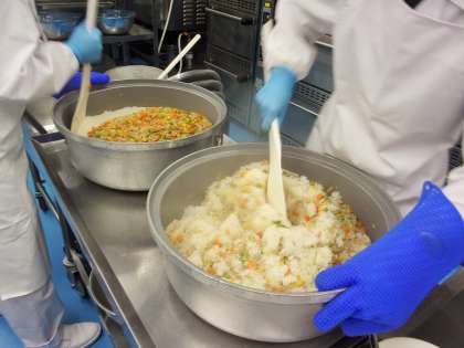 給食室では、器械を使って野菜を切ることもありますが、ほとんどの野菜を調理員さんが包丁を使って切っています。