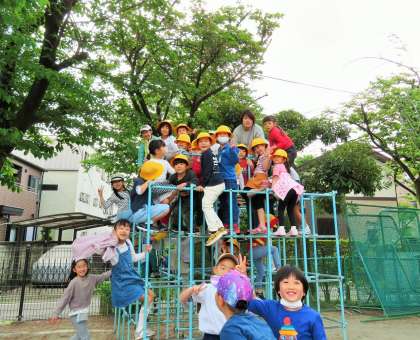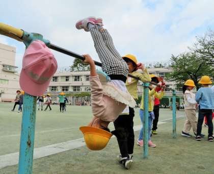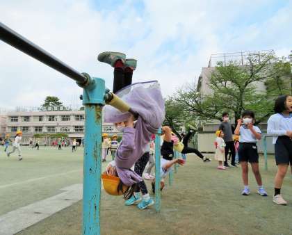 鉄棒で前回りや逆上がりを見せてくれる子がいます。ジャングルジムでは先生も一緒に遊んでいました!