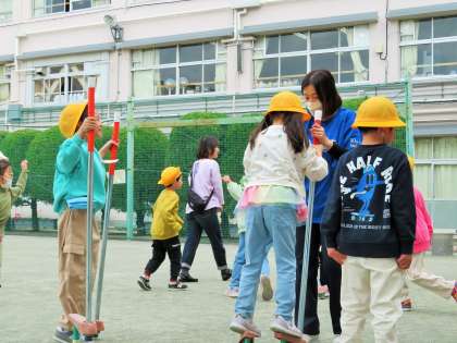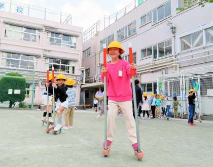 先生と一緒に竹馬にもチャレンジしています。これからも、校庭でどんどん遊んでほしいと思っています!