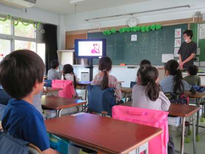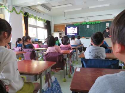 写真は、「先生紹介動画」を見ている1年生教室の様子です。