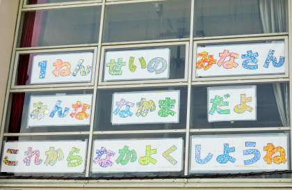 体育館の窓には、5年生が作成した「1ねんせいのみなさん みんななかまだよ これからなかよくしようね」の文字が掲示されていました。掲示でも気持ちを表しています。