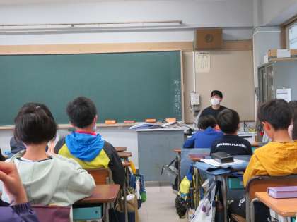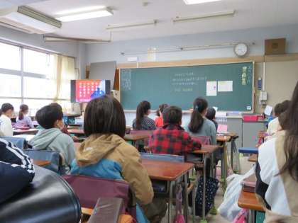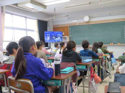 写真は、放送朝会を聞いている4年生の様子です。