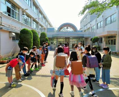5月の「優郷の学び舎」あいさつ運動1日目です。正門と南門に分かれ、登校して来る子どもたちへ気持ちのよいあいさつを投げ掛けてくれています。