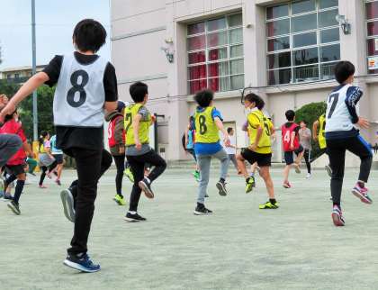 今日から「5,6年生リレー」の朝練習がはじまりました。まずは、先生と一緒にウォーミングアップからスタートです。