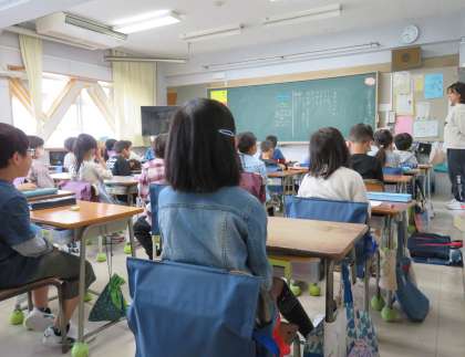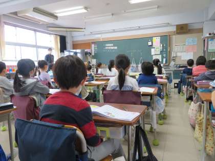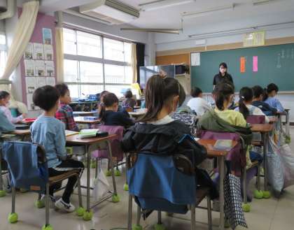 写真は、放送朝会を聞いている2年生の様子です。
