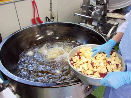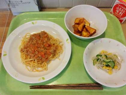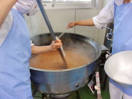 給食では、たくさんのたまねぎを使って、甘みのある肉みそを作りました。