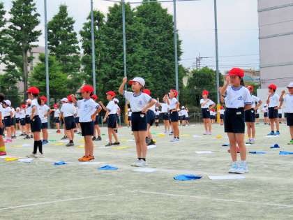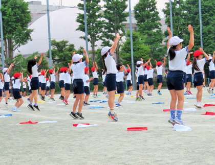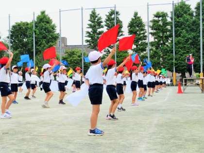 3年生の表現は、「THREE★PIECE〜動き・笑顔・心を一つに〜」です。子どもたちのアンケート結果で決まった曲「新時代」に合わせて、はじめてのフラッグに挑戦します。