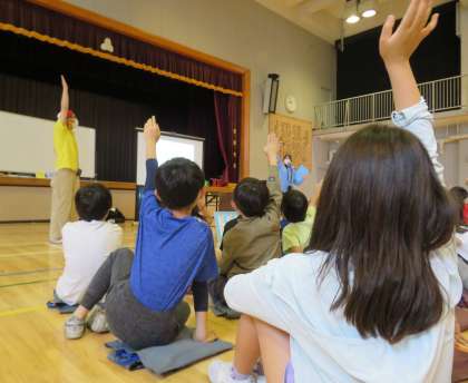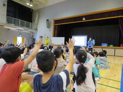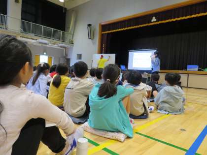 今日は4年生が、東京都下水道局の出前授業「下水道キャラバン」を受けました。「使い終わったあとの水をきれいにして、また使えるようにしている」方々のお仕事を学習しました。