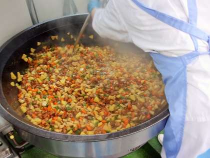 今日の酢豚には、豚肉やじゃがいも、にんじん、たまねぎ、たけのこ、しいたけ、ピーマンが入っていて、お肉も野菜もいっぱい食べられる料理です。