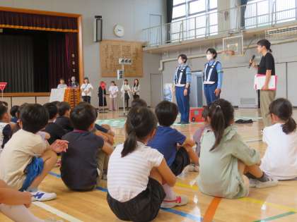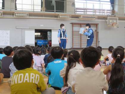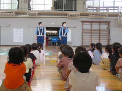 今日は1年生が、世田谷警察署の方々をお招きして、交通安全教室を行いました。横断歩道の歩き方や、駐車している車の横を通るときのポイントを学びました。
