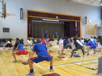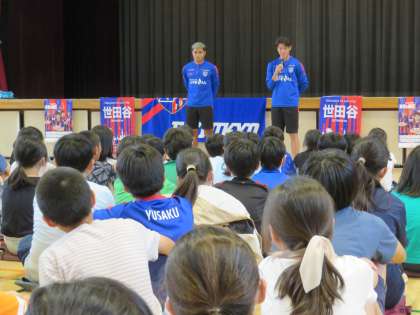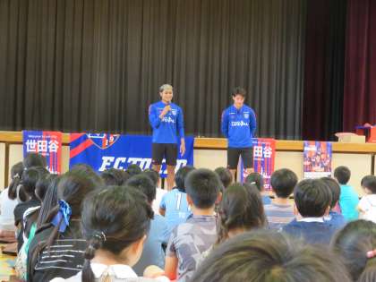 5年生が「FC東京選手会授業」を受けることができました。この企画は、FC東京選手会の皆さんのご協力があり実現しました。今回は、若手で期待の大きい俵積田 晃太選手と3月に日本A代表に選出されたバングーナガンデ佳史扶選手、そしてコーチの3名にお越しいただきました。まずは、自己紹介、次に練習で取り組んでいるストレッチを教えていただきました。
