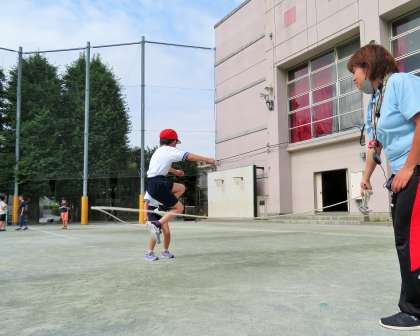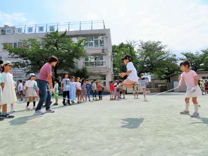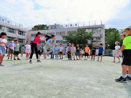 今日は、2・4・5年生の体育朝会です。長縄跳びは、学級のチームワークづくり、運動感覚づくりにはとてもよい運動種目なので全校で取り組みます。