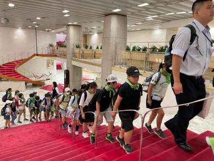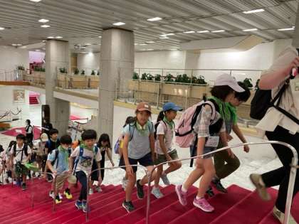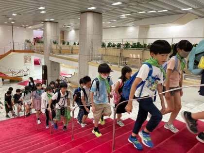 赤じゅうたんの階段を歩く子どもたちは、わくわくどきどきです!