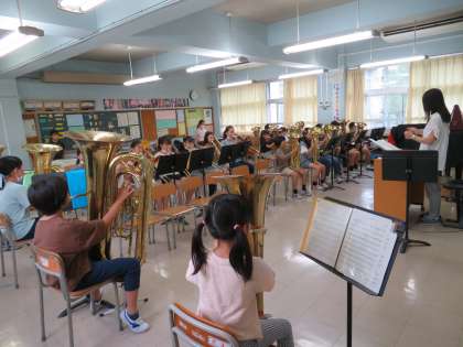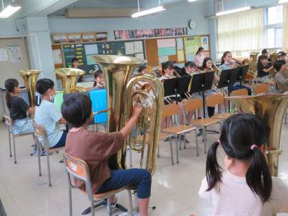 金管バンドは毎朝活動しています。音楽室や会議室に入ると、いつも気持ちのいいあいさつがあり清々しい気持ちになります。現在は新入部員の4年生の育成がメインです。