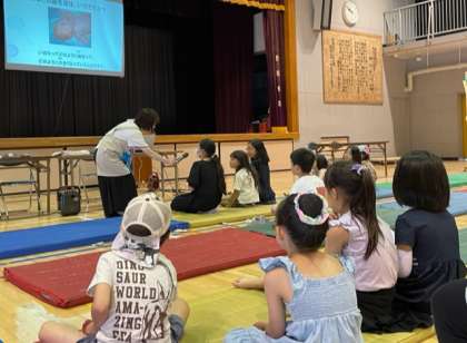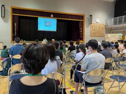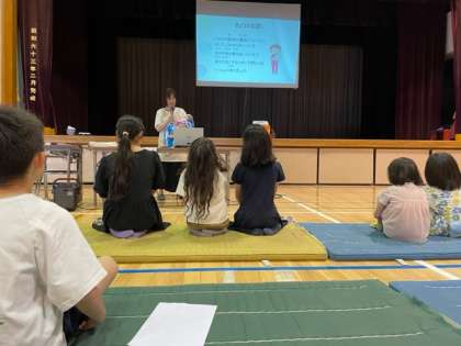 今年度最初の家庭教育学級として「親子で一緒に学んで話そう! “性”について〜小学生のうちに伝えたい大切なこと〜」をテーマに、助産師の岩佐寛子さんをお招きし、体育館にて講演会を開催しました。前半は、いのちはお腹の中でどのように成長していくのかをご紹介いただくと共に、事前アンケートの質問に答える形で進行しました。