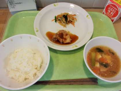 今日の給食は、もやしと小松菜、にんじんの3種類の野菜を使ってナムルを作りました。