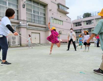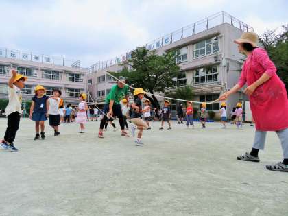 第2回目1・3・6年生の体育朝会の様子です。長縄跳びは、学級のチームワークづくり、運動感覚づくりにはとてもよい運動種目なので全校で取り組みます。それぞれの学年・学級ごとに目標は異なりますが、自分たちのチームの力を信じて、目標を掲げがんばっています。