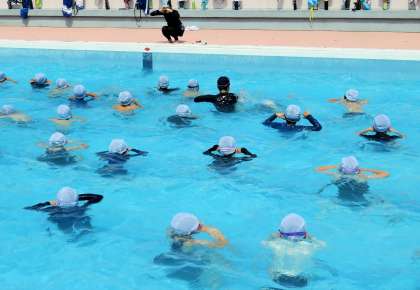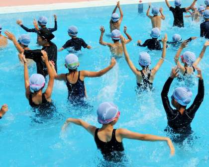 今日は絶好のプール日和です。まずはウォーミングアップで、ドラえもんの曲に合わせた「リズム泳」からスタートです。