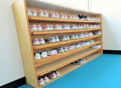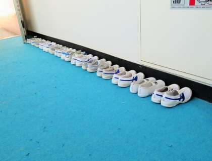 松丘小学校で大切にしている取り組み「あそべくつ」の「靴揃え」は、プールの下駄箱でも意識高く取り組むことができています。