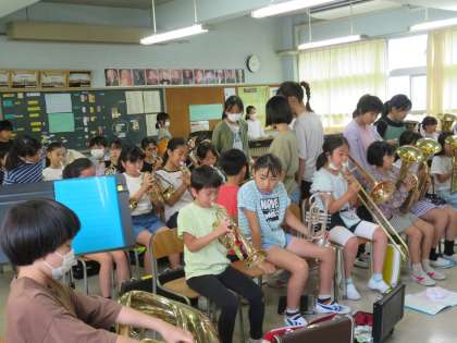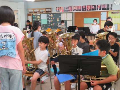 金管バンドは毎朝活動しています。音楽室に入ると、いつも気持ちのいいあいさつがあり清々しい気持ちになります。新入部員4年生の育成がメインでしたが、新入部員のみで「こんにちはトランペット」が演奏できるようになりました。