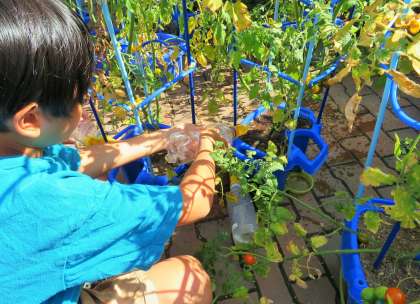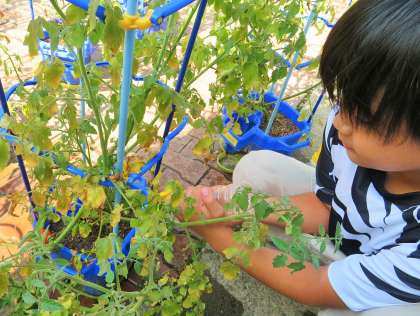 2年生が水やりをして、大切に育てているミニトマトの実が、次々と食べ頃に育っています。真っ赤なおいしそうなミニトマトです。