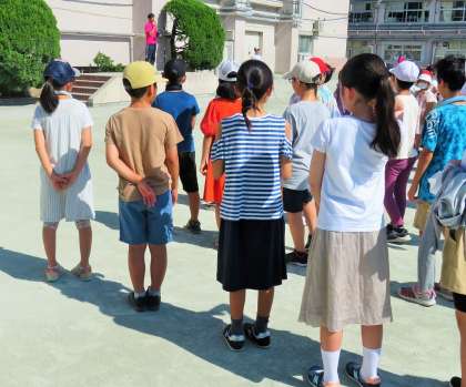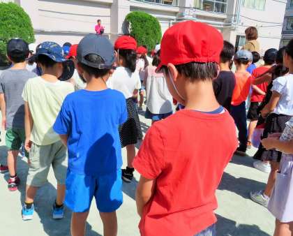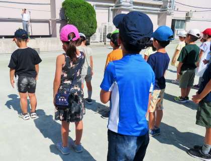 暑い中でしたので、水分補給、帽子着用を呼びかけ話は短くしました。姿勢よく話を聞いている子が多く嬉しく思いました。