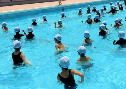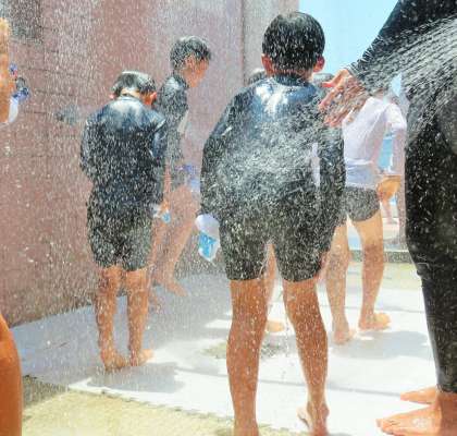 今日も絶好のプール日和です。1年生は大きなプールでの並び方、シャワーの浴び方、タオルの置き方、入水の仕方など、一つ一つの学習にだいぶ慣れてきました。地獄のシャワーも3度目の体験です!