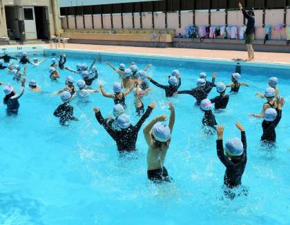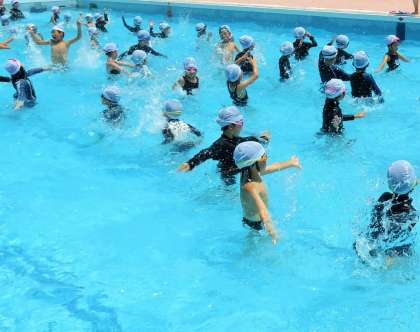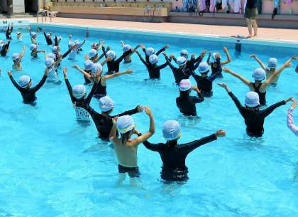 まずはウォーミングアップで、ドラえもんの曲に合わせた「リズム泳」からスタートです。