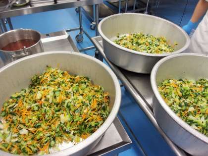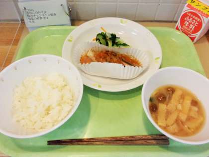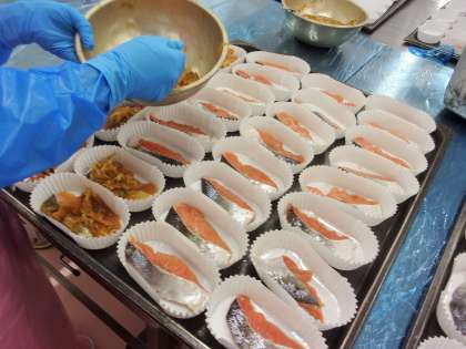 給食では一人分ずつカップに入れて作りますが、漁師さんは大きな鉄板に大きな鮭の切り身をのせて作るそうです。