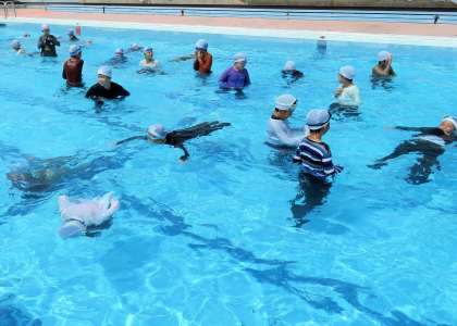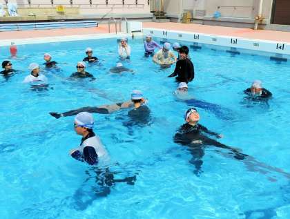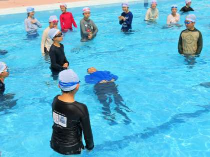 浮くためには何をすればよいのかを考え、服の中に空気を入れました!