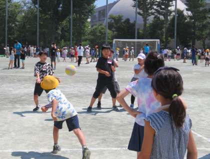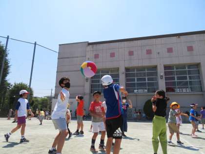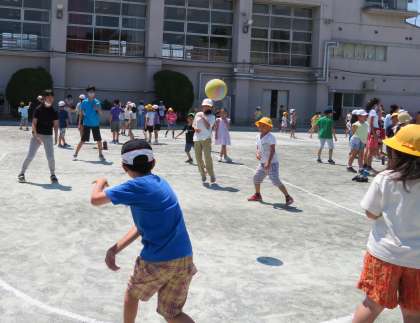 写真は、「ドッジボール」「風船バレー」で遊んでいる班の様子です。