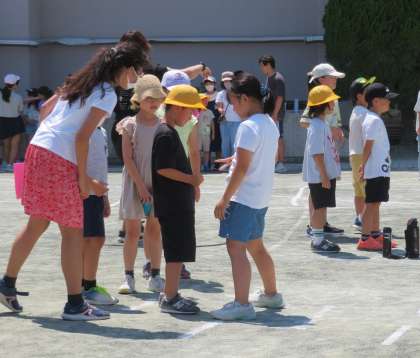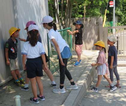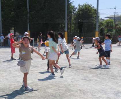 写真は、「だるまさんが転んだ」で遊んでいる班の様子です。