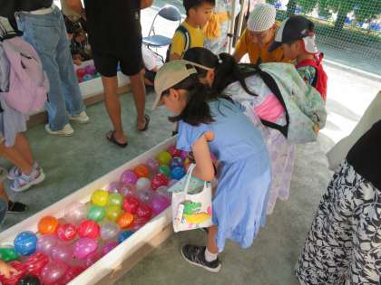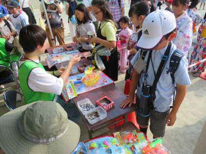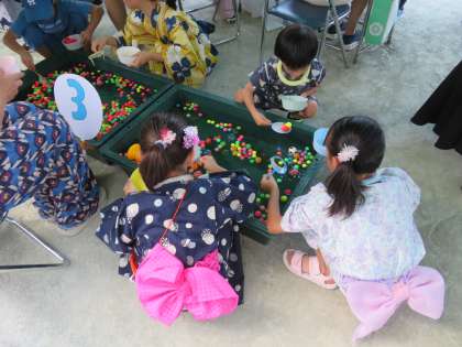 スーパーボールすくい、ヨーヨーすくい、くじ引き、どのお店も盛り上がっています。