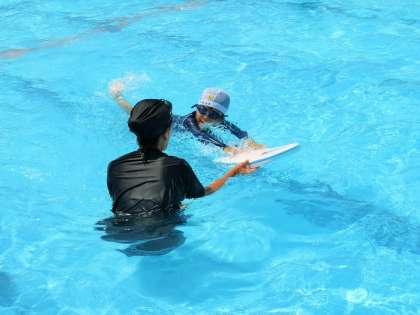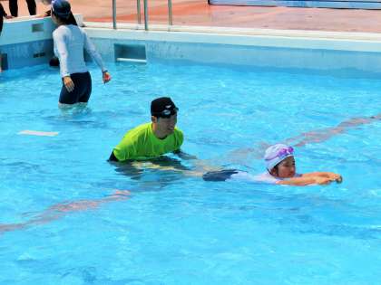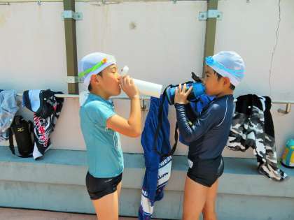 多くの先生がプールに入っているので、グループごとにじっくり見てもらいながら検定試験ができます。こまめな水分補給も行っています。
