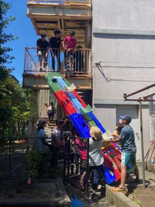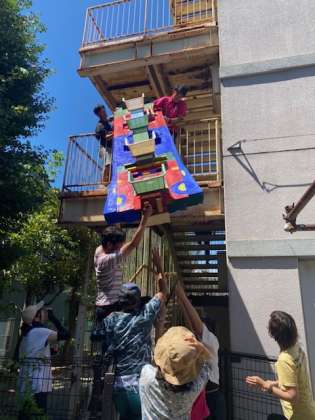 いかだを4階まで引き上げること、下ろすことも大変な作業ですが、多くの先生たちが力を合わせ協力しています。