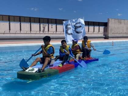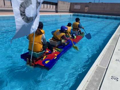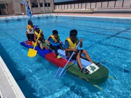 アドベンチャーin多摩川いかだ下り大会に出場する、5年生の手作りいかだ1艇がプールで試乗会を行いました。子どもたちと先生が力を合わせて実際に漕いでみました。