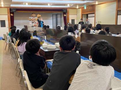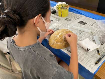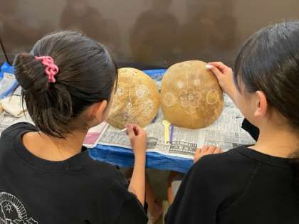 今夜はふくべ細工に挑戦です。ふくべは夕顔の実、干ぴょうのことです。職人さんから作り方の基本を教えていただきました。まず、ふくべにチョークで絵を描きます。