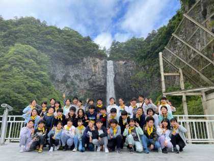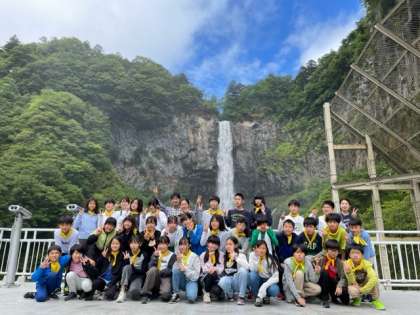 華厳の滝に到着しました。奇跡的に青空が広がっています。落差97mの迫力ある滝を見ることができました。これだけ水量豊富な滝を見られることはなかなかありません。本当に運のいい子どもたちです。