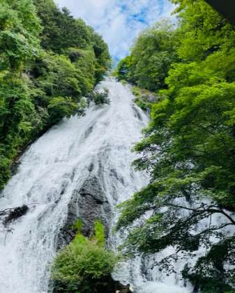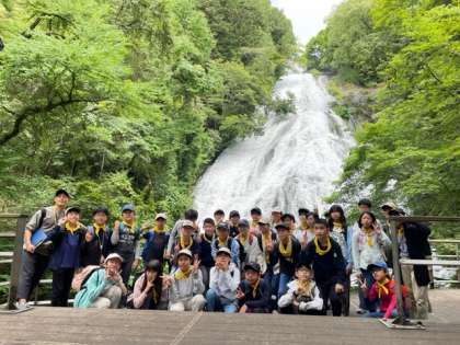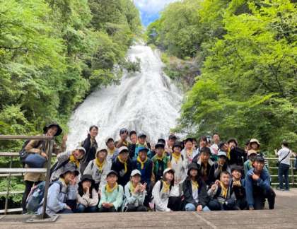 湯滝で集合写真を撮りました。清涼感をみんなで満喫しました!
