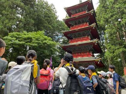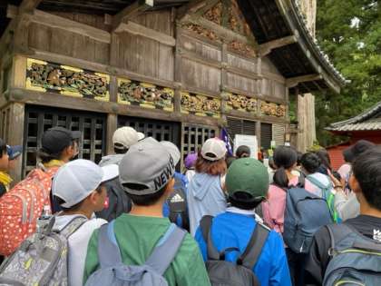 世界遺産の日光東照宮に到着しました。案内人の方が説明をしてくださり、子どもたちも真剣に聞いています。