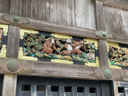五重塔、そして「見ざる、言わざる、聞かざる」で有名な三猿の説明を聞きました。