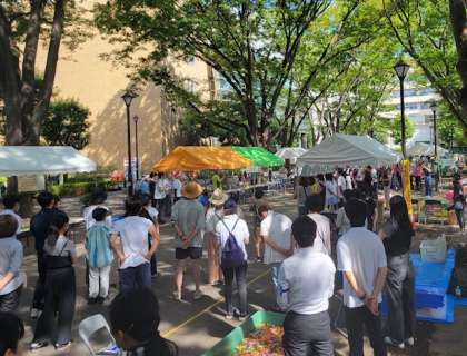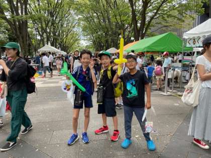 今日は青少年上町地区委員会主催「第60回子ども大会」が、馬事公苑けやき広場で盛大に行われました。歴史ある「子ども大会」の会場には多くのお店が並んでいます。まずは開会式からスタートです。