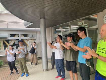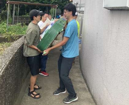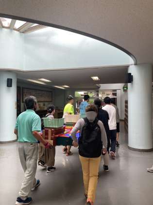 今日は「第26回アドベンチャーin多摩川いかだ下り大会」です。松丘小学校からは、5年生の「チームモカラテ」号が出廷しました。モカとラテは松小のウサギの名前です。いかだは、夏休み中に子どもたちと先生が力を合わせて作ったものです。まずは、屋上プールからいかだを運んでトラックへと積み込みました。