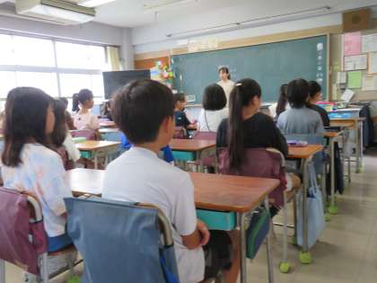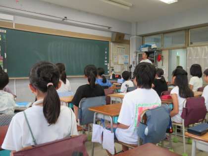 写真は、話を聞いている5年生の様子です。