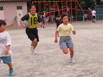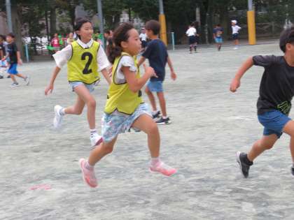 ゼッケンを付けた運動委員の子や先生が鬼ごっこで遊んでくれています!