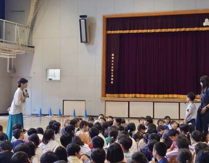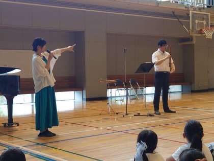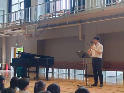 本日、1〜3年生の子どもたちは「ミニコンサート」を体育館で鑑賞しました。プロの演奏家である「エバリー」の方々をお招きして、子どもたちの前でピアノと尺八の生演奏を披露していただきました。