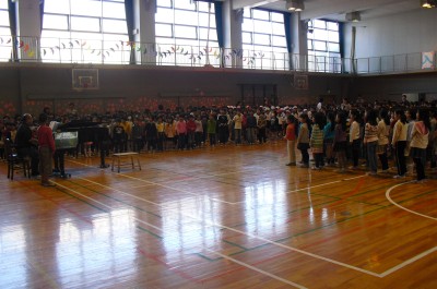 明日は1年生を迎える会です。今日はその練習を音楽朝会でしました。